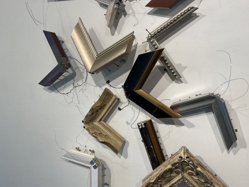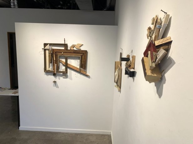 Working with what I had in my studio was meant to be. Leftovers from starting my larger pieces and from finished pieces – off cuts of frames, a bric-a-brac of wires, hinges and nails. This exhibition is about the parts of what makes up a painting hung on a wall without the painting. The pandemic hit – things fell apart, and much was revealed. Things such as inequalities and what we truly need to sustain us. These pieces are about unmaking and making new. DP