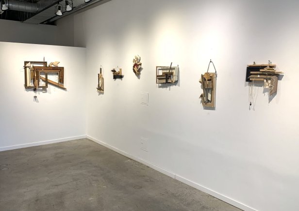 Bugs in my Head at Propeller Gallery in Toronto, in 2023, saw Doris Purchase further distill her exploration of Painting through metaphor. In this exhibition she uses the signature elements of her materials palette to go beyond individual assemblage pieces. She creates an array of similar-sized, smaller constructions, which are presented on the gallery wall as installation. Sliced frames, wires, screws, and quotidian connectors are composed with great wit and re-imagined as “bugs” in all their variety.